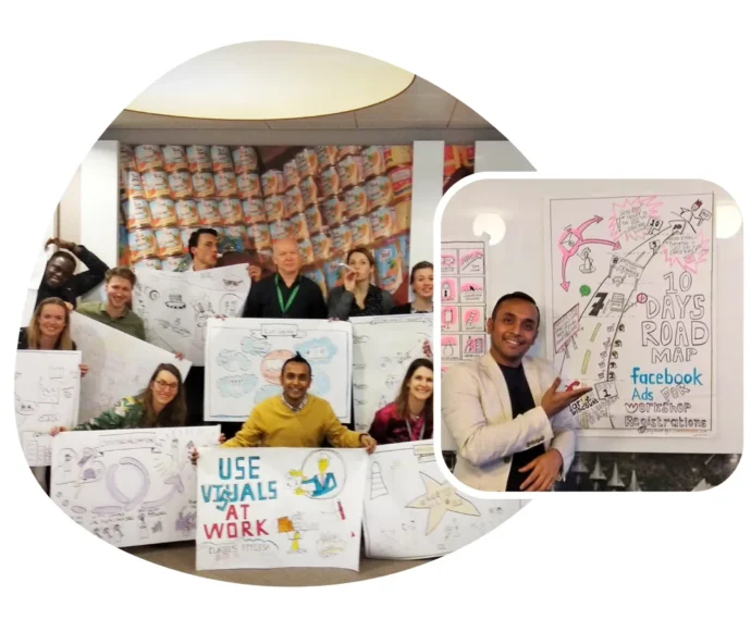 Creative learning sessions where participants learn to think and communicate visually — turning complex ideas into simple, shareable visuals