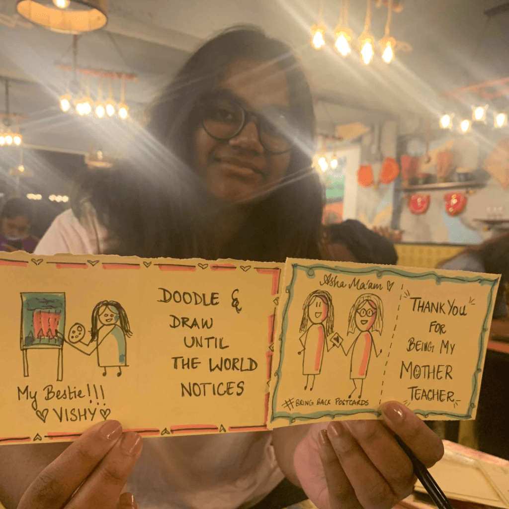 Every month, our community gathers ONLINE and OFFLINE (in various cities, check city wise schedule here) to create and share personalized postcards. But these aren’t just any postcards. We transform them into unique pieces of appreciation based sketchnotes for our colleagues and friends. Here’s how we do it: