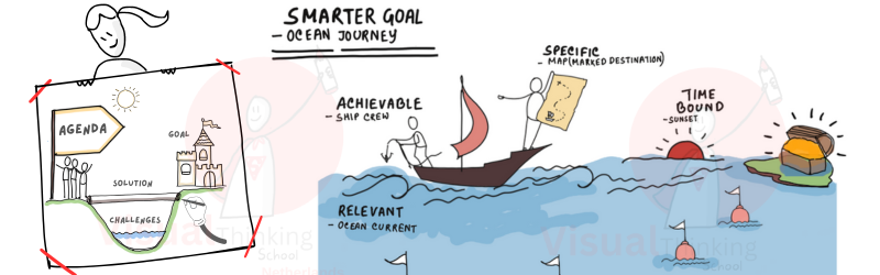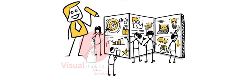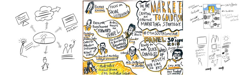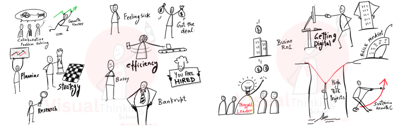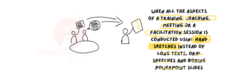 When all the aspects of a facilitation session, training, coaching or a business meeting is conducted using hand sketches INSTEAD OF long texts, oral speeches and boring powerpoint slides.