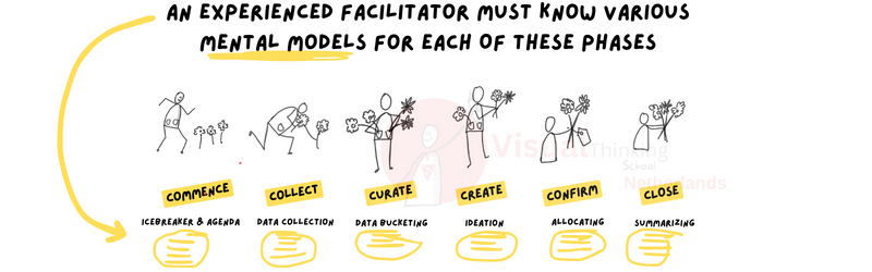 As you must have noticed, each of these 6 phases has many mental models (exercises) associated with it. An experienced graphic facilitator must know many game plays under each head.