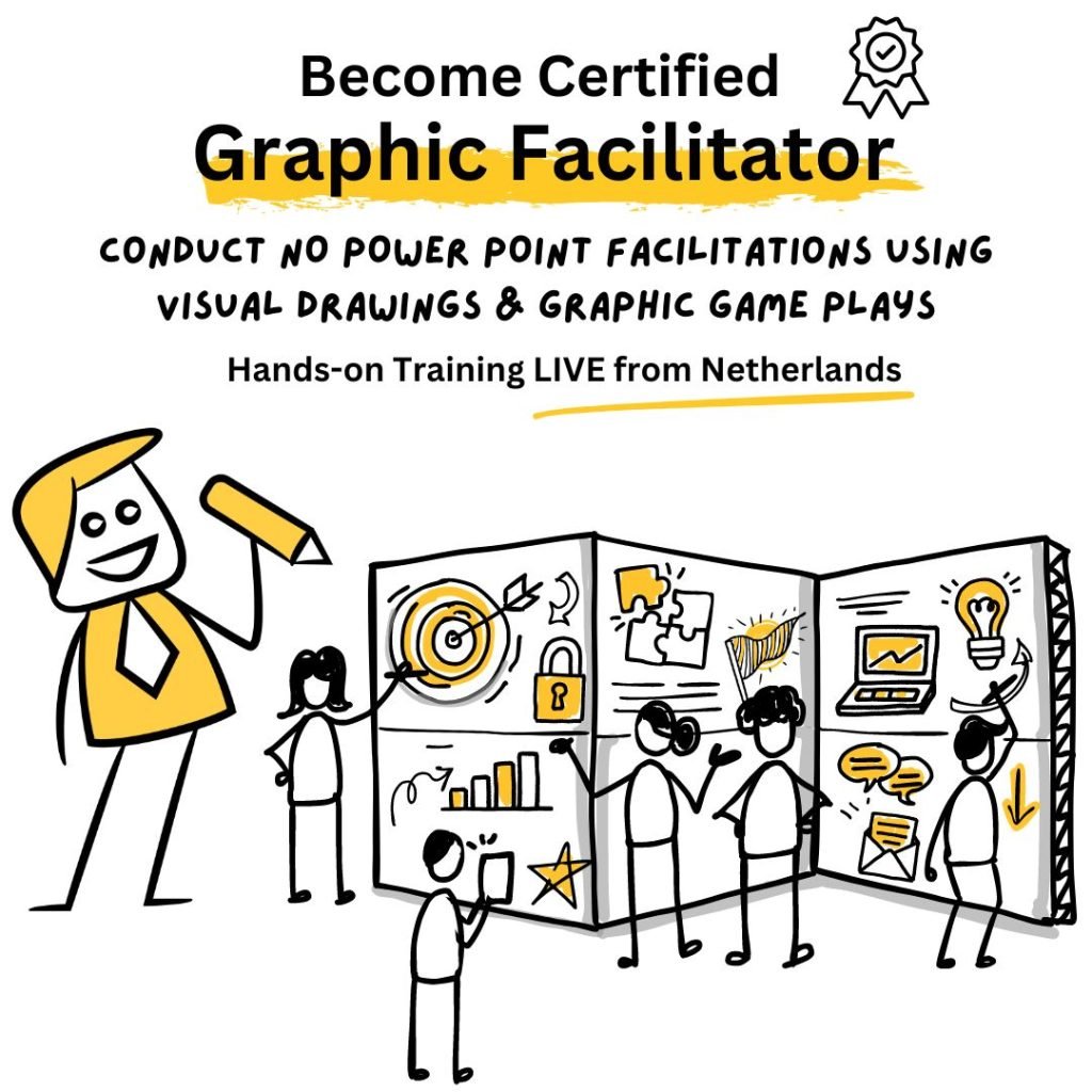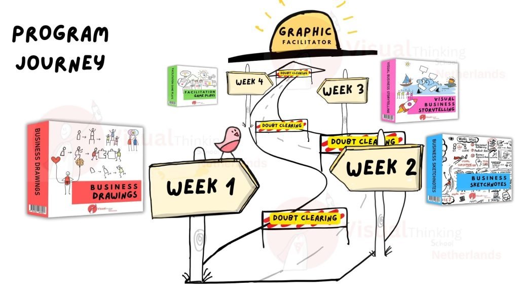 We have designed a unique 4 weeks program on “Graphic Facilitation Certification” which constitutes of 31 hours of LIVE trainings from Netherlands. This covers all the four Visual Skills shared above.