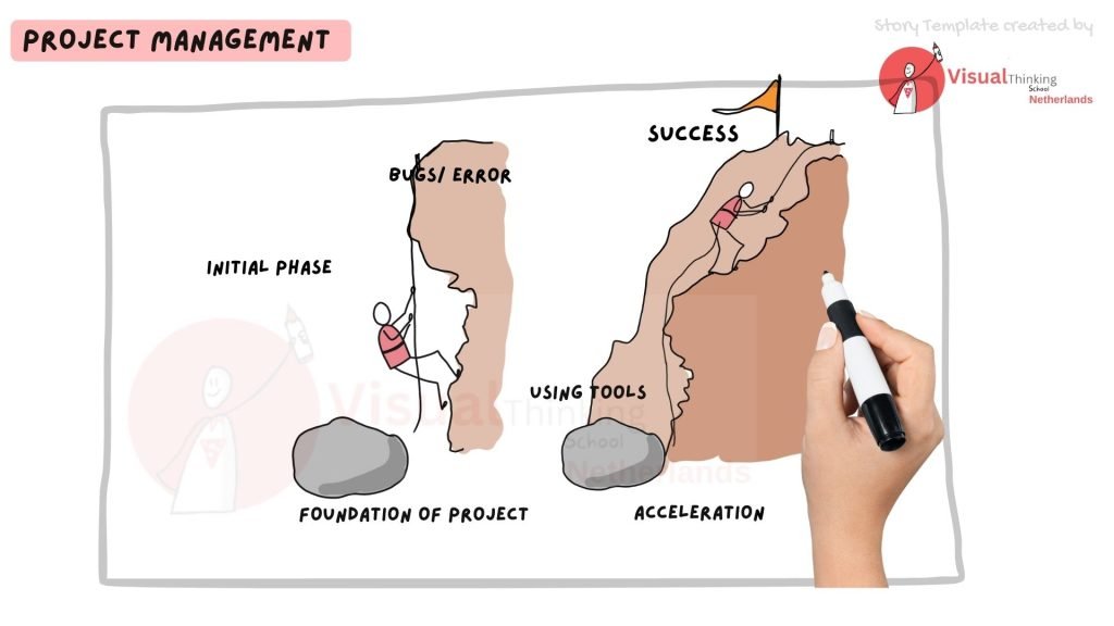 The visual depicts a mountain, symbolizing the journey of personal growth. One person is shown climbing the mountain slowly, representing the path of determination and perseverance. Another person is using a big stone as a stepping stone to climb more efficiently, symbolizing the use of tools or support in personal growth.