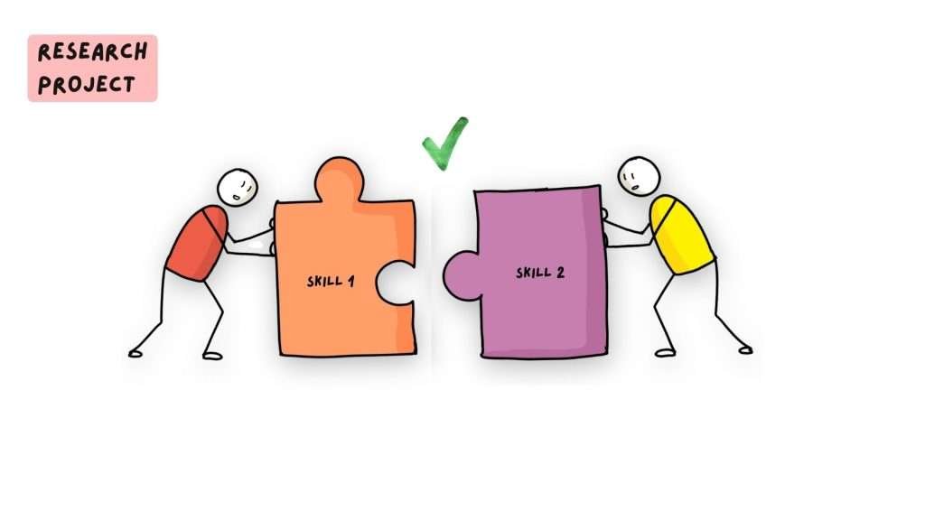 Consider a research project that requires expertise in both data analysis and subject matter knowledge. Two colleagues, each an expert in one of these areas, collaborate to complete the project. By combining their unique skills and working together, they effectively tackle the challenge and achieve a successful outcome.